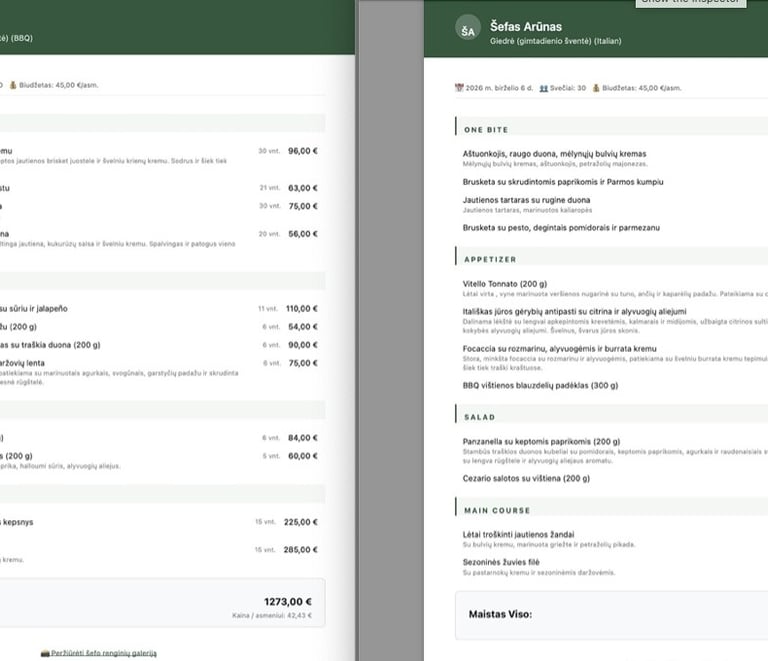 CaterYzi platforma šefams leidžia naudotis pasiūlymų generatoriumi nemokamai. Taip, reikia įsikelti savo meniu patiekalus. Ir net čia dirbtinis intelektas padaro 80 proc. darbo už jus. Jums tereikia įmesti savo meniu, DI jį išpakuoja ir sudėlioja pagal kategorijas. Jums tereikia peržiūrėti kainas, minimalius užsakymo kiekius, pasižymėti savo favoritinius patiekalus. Ir viskas. Jūs galite naudoti pasiūlymų generatorių. Per 5 minutes galite paruošti kelis skirtingus pasiūlymus klientui.
